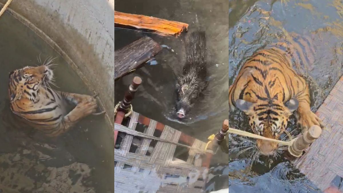 सूअर का पीछा करते हुए कुएं में गिरा बाघ